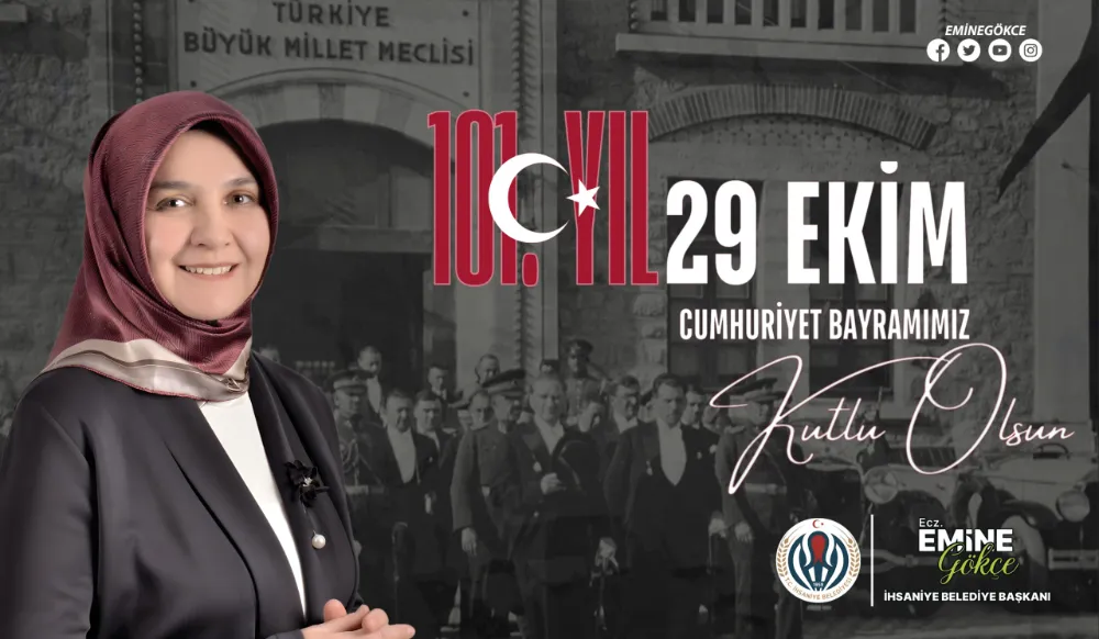 Türkiye Cumhuriyeti’nin 101. Yılı ve ‘Türkiye Yüzyılı’ olarak addedilen sürecin başlangıcı 29 Ekim Cumhuriyet Bayramı dolayısıyla tüm yurtta başlatılan kutlamalar kapsamında İhsaniye Belediye Başkanı Ecz. Emine GÖKÇE de bir mesaj yayımlayarak milli egemenliğin dayanağı Cumhuriyet’in ilanını kutladı.